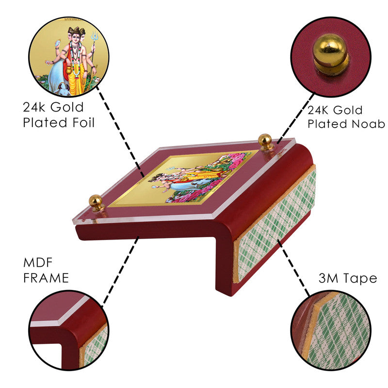 This Dattatreya frame serves as an exquisite addition to your car dashboard, home, table, office, shop or showroom. You can also use it in your Puja room to create a serene and sacred atmosphere. Made from high-Wooden Materials and adorned with 24K gold-plated foil, this divine frame is crafted to withstand the test of time, ensuring long-lasting spark and durability.