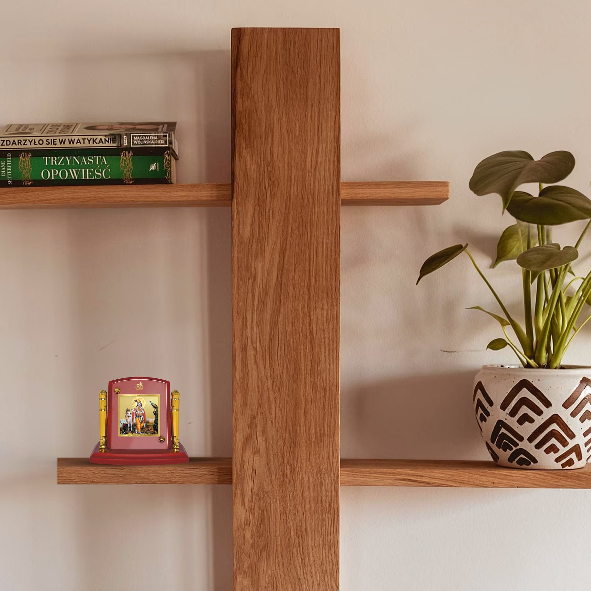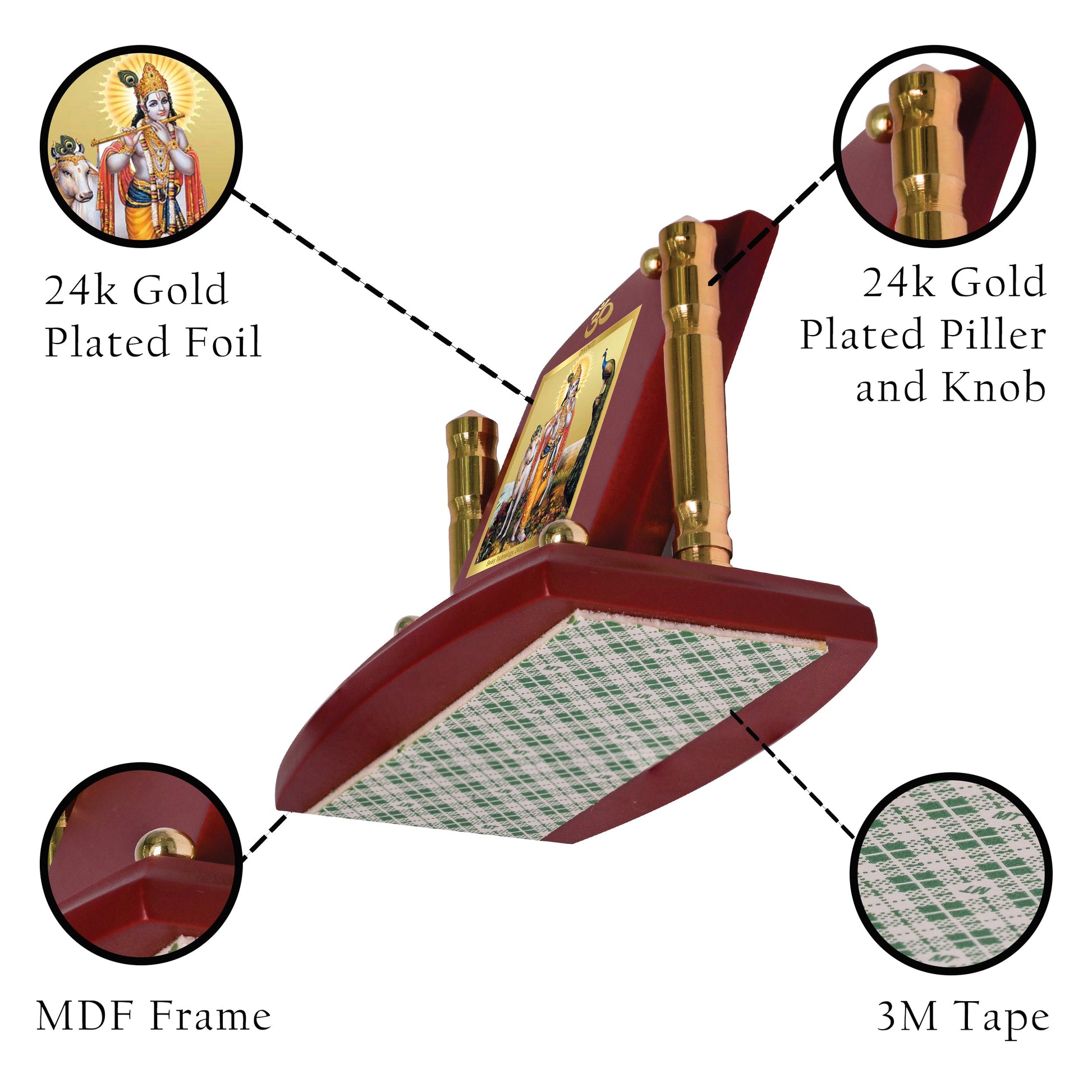 This Krishna Ji frame serves as an exquisite addition to your car dashboard, home, table, office, shop or showroom. You can also use it in your Puja Prayer room to create a serene and sacred atmosphere. Made from Wooden Material and adorned with 24K gold-plated foil, this divine frame is crafted to withstand the test of time, ensuring long-lasting spark and durability.